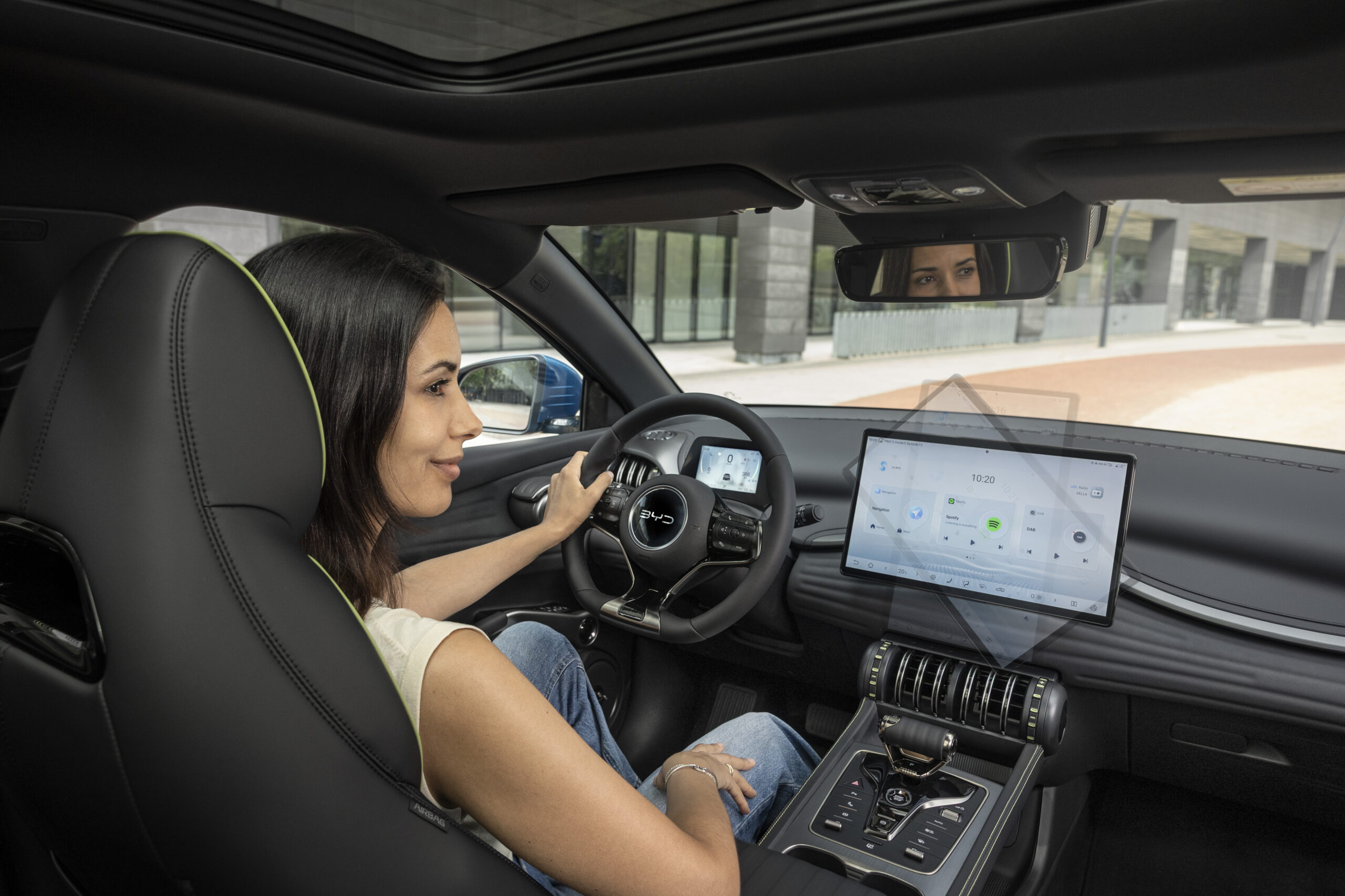 Das zentrale Highlight im Cockpit ist das 15,6-Zoll-Touchdisplay, das sich per Knopfdruck von Hoch- auf Querformat drehen lässt. So haben Sie Navigation, Entertainment und Fahrzeugfunktionen immer optimal im Blick – ganz nach Ihren Vorlieben. Die smarte Kabine überzeugt mit Apple CarPlay3 sowie Android Auto4 und lässt sich ganz einfach per Sprachbefehl “Hi BYD” steuern – ganz ohne Lenkrad.