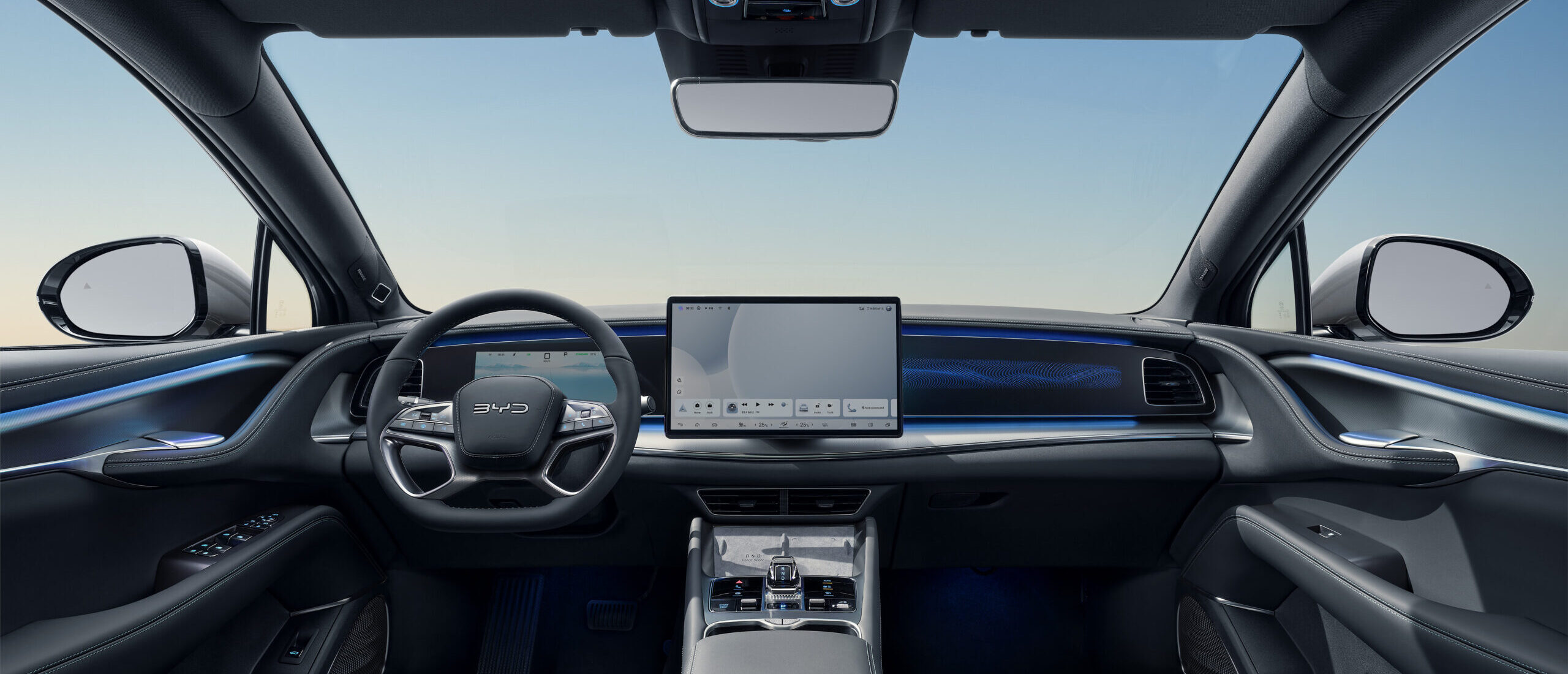 Das zentrale Highlight im Cockpit ist das 15,6-Zoll-Touchdisplay, das sich per Knopfdruck von Hoch- auf Querformat drehen lässt. So haben Sie Navigation, Entertainment und Fahrzeugfunktionen immer optimal im Blick – ganz nach Ihren Vorlieben. Die smarte Kabine überzeugt mit Apple CarPlay3 sowie Android Auto4 und lässt sich ganz einfach per Sprachbefehl “Hi BYD” steuern – ganz ohne Lenkrad.
