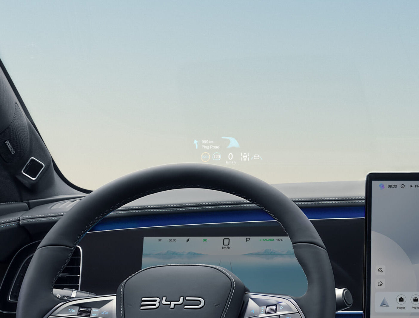 Das Head-up-Display* im BYD SEALION 7 projiziert alle wichtigen Fahrinformationen direkt in Ihr Sichtfeld – für mehr Sicherheit, Komfort und ein fokussiertes Fahrerlebnis.