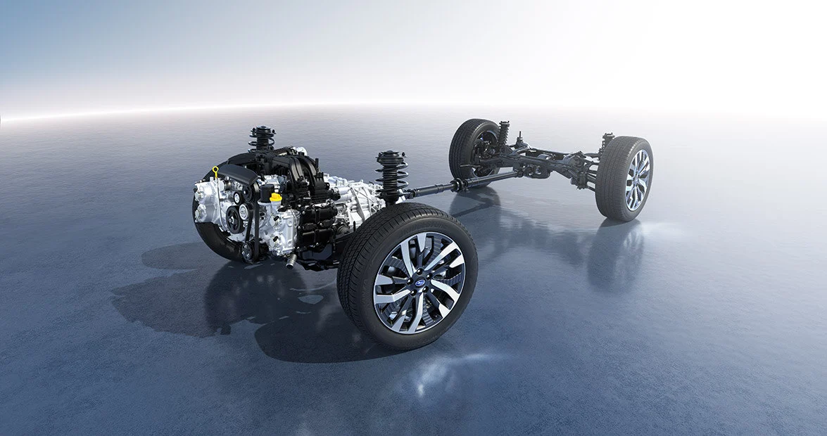 Beim permanenten Allradantrieb „Symmetrical AWD“ von Subaru liegen Motor, Getriebe und Kardanwelle in einer Linie. Diese Subaru-typische Konstruktion leitet die Antriebskräfte perfekt ausgeglichen an die Räder weiter, was das Auto ebenso stabil wie agil macht.