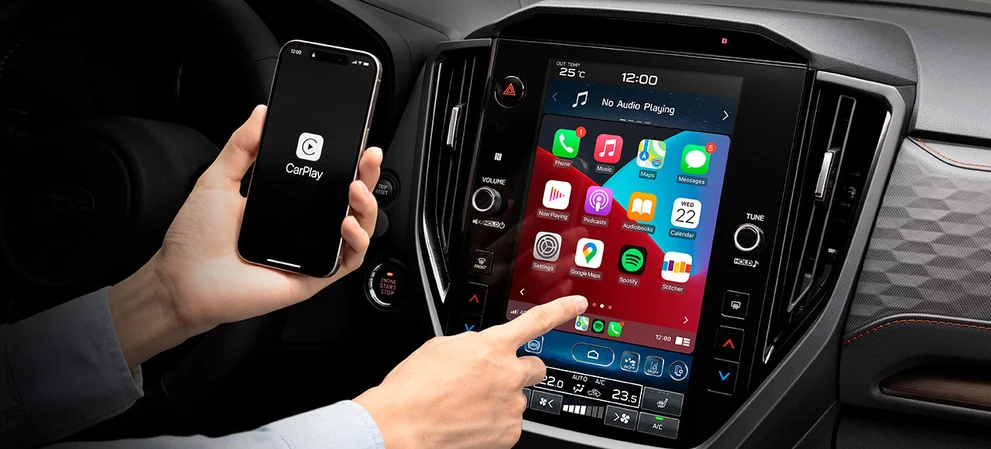 Apple CarPlay und/oder Android Auto™ sind möglicherweise nicht in allen Regionen verfügbar. Zudem kann die Kompatibilität je nach Smartphone-Modell abweichen. Nähere Informationen erhalten Sie von Ihrem autorisierten Subaru Händler vor Ort. Der Fahrer ist stets für eine sichere und aufmerksame Fahrweise verantwortlich. Bitte bedienen Sie den Touchscreen-Monitor nicht während der Fahrt.