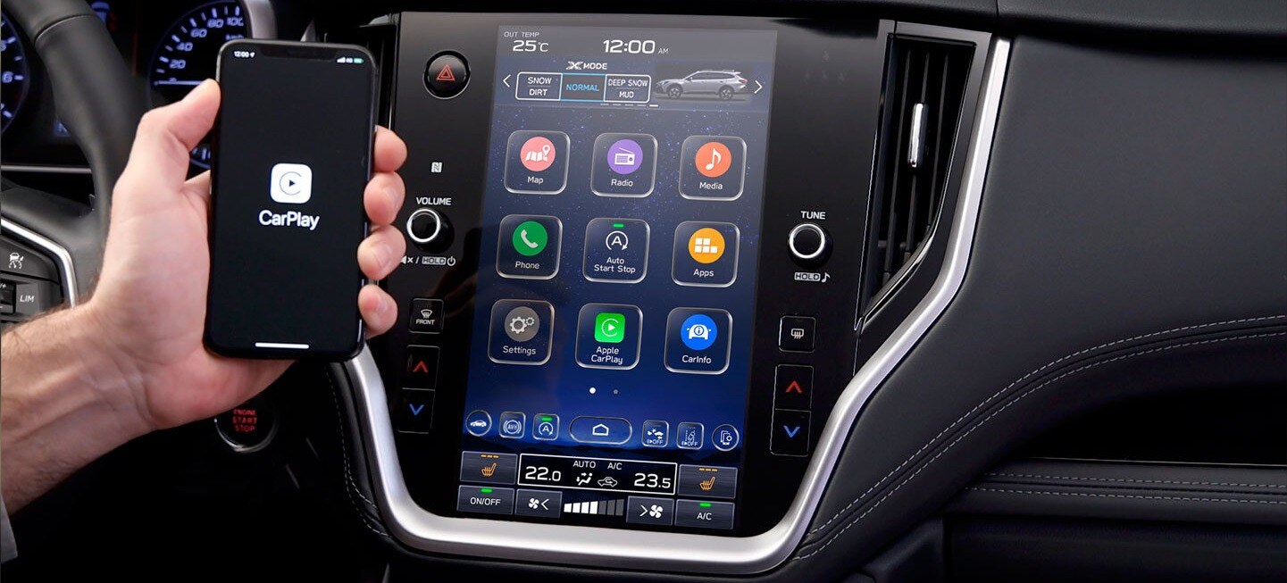Apple CarPlay und/oder Android Auto™ sind möglicherweise nicht in allen Regionen verfügbar. Zudem kann die Kompatibilität je nach Smartphone-Modell abweichen. Nähere Informationen erhalten Sie von Ihrem autorisierten Subaru Händler vor Ort. Der Fahrer ist stets für eine sichere und aufmerksame Fahrweise verantwortlich. Bitte bedienen Sie den Touchscreen-Monitor nicht während der Fahrt.